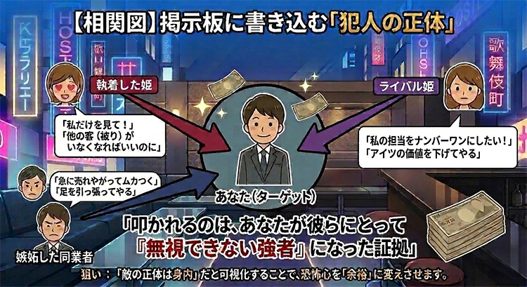 自分への接客に不満がある時、匿名で「あいつは枕営業ばっかり」などと書き、あなたを孤立させてコントロールしようとします。