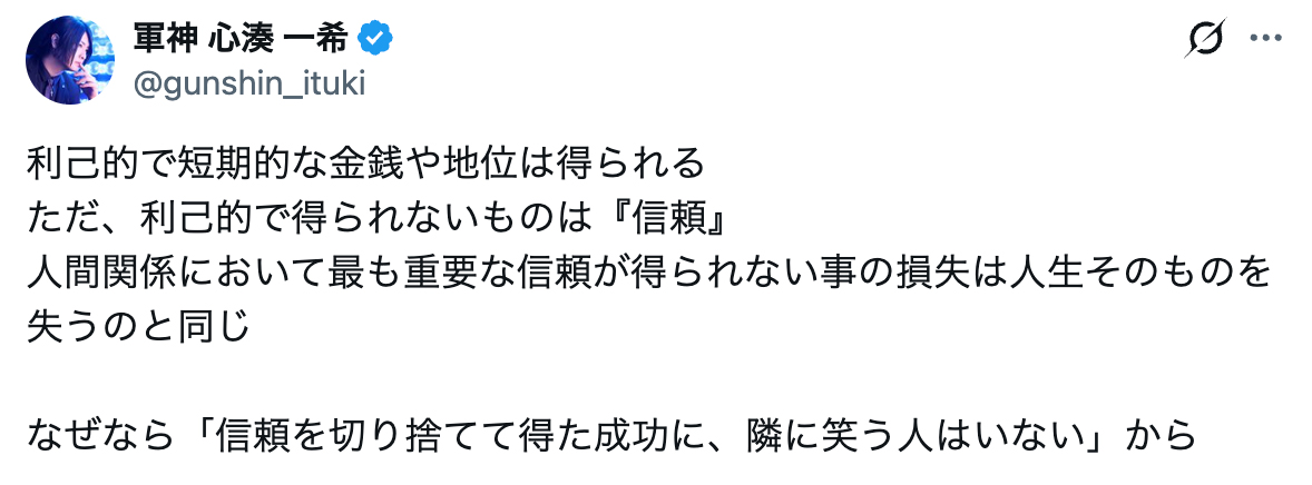 なぜなら「信頼を切り捨てて得た成功に、隣に笑う人はいない」から。