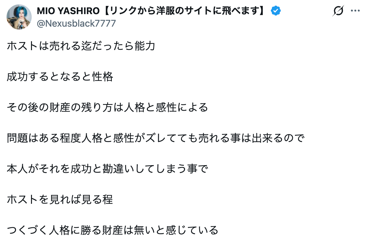 ホストは売れるまでだったら能力。成功するとなると性格。